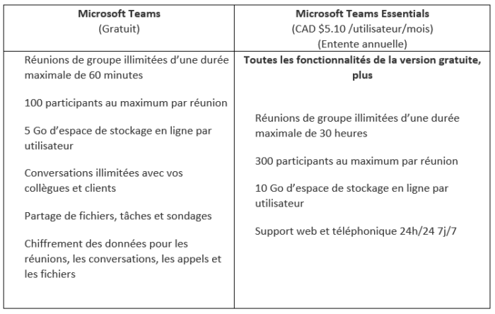 Comparaison entre la version gratuite de Microsoft Teams et Teams Essentials :