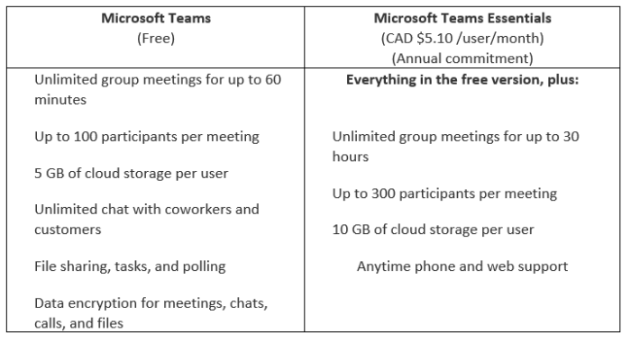 Comparison between the free version of Microsoft Teams and Teams Essentials:
