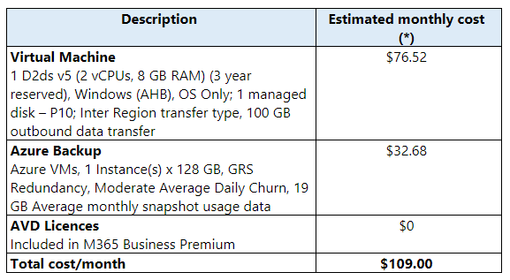 A small company is using Microsoft 365 Business Premium and has an accounting software on-premises (Acomba or QuickBooks for example). There are 3 users accessing this application. How much will be the cost if this company decides to use AVD? You can see here that the cost is very interesting (37$ /user/month) and there is no upfront cost.
