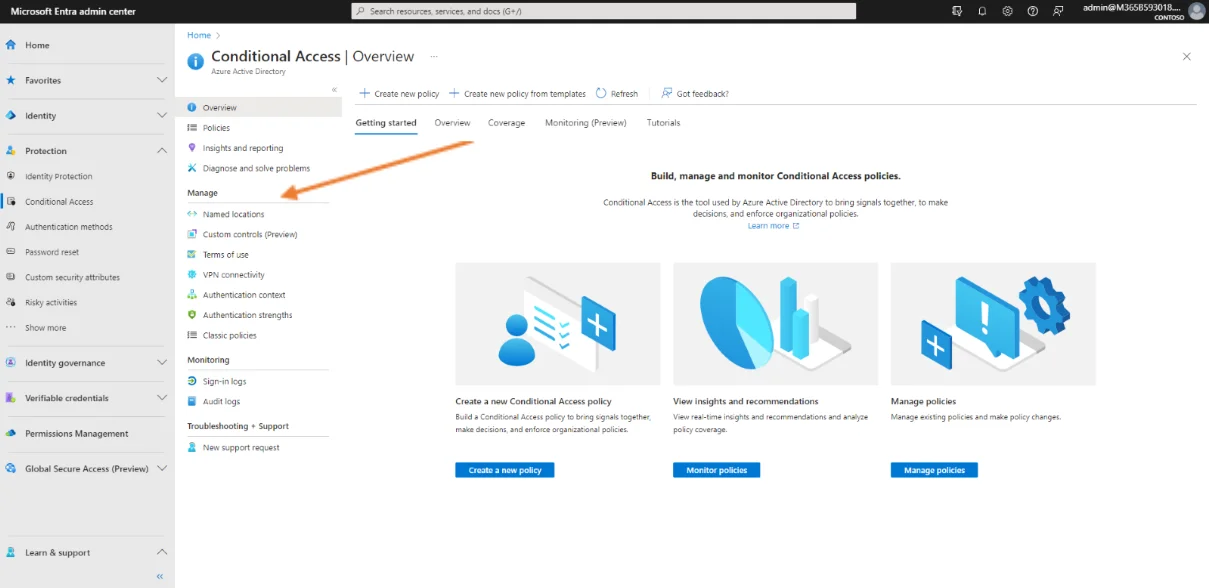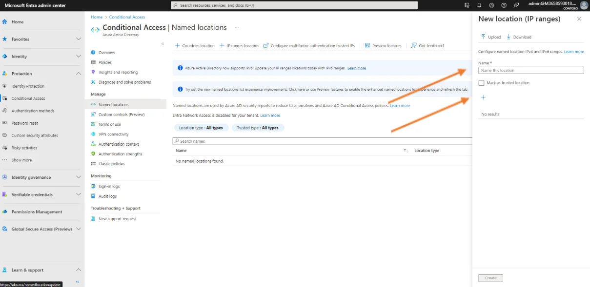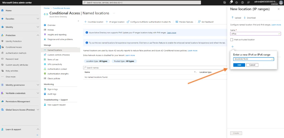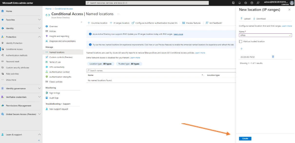By clicking on Named location, in the Conditional access management window, the location in question can be created.