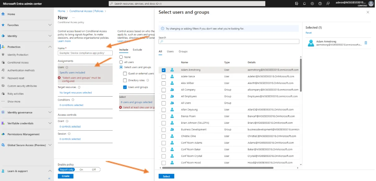 Then, navigate to the Assignments section and in the Users subsection click on Specific users included. In the example a single user was chosen as the one who would be targeted by this policy. Once you have checked the user in question, click on Select. No users are excluded from this policy.