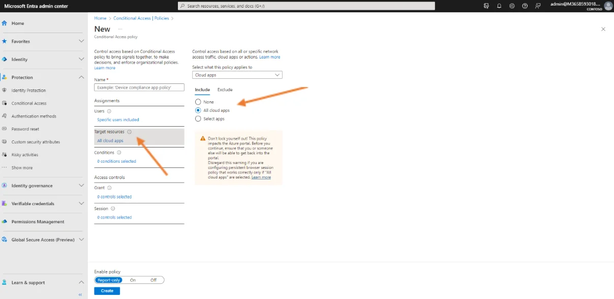 Third, navigate to the Target Resources subsection. Click on “Include All cloud apps”. No applications are excluded from this policy.