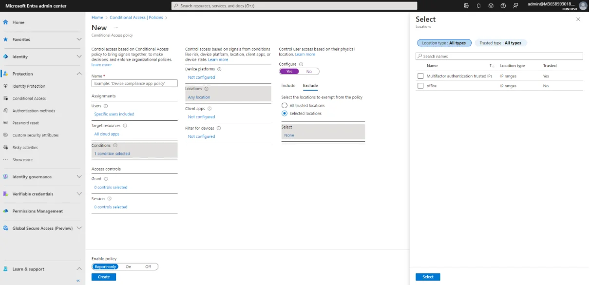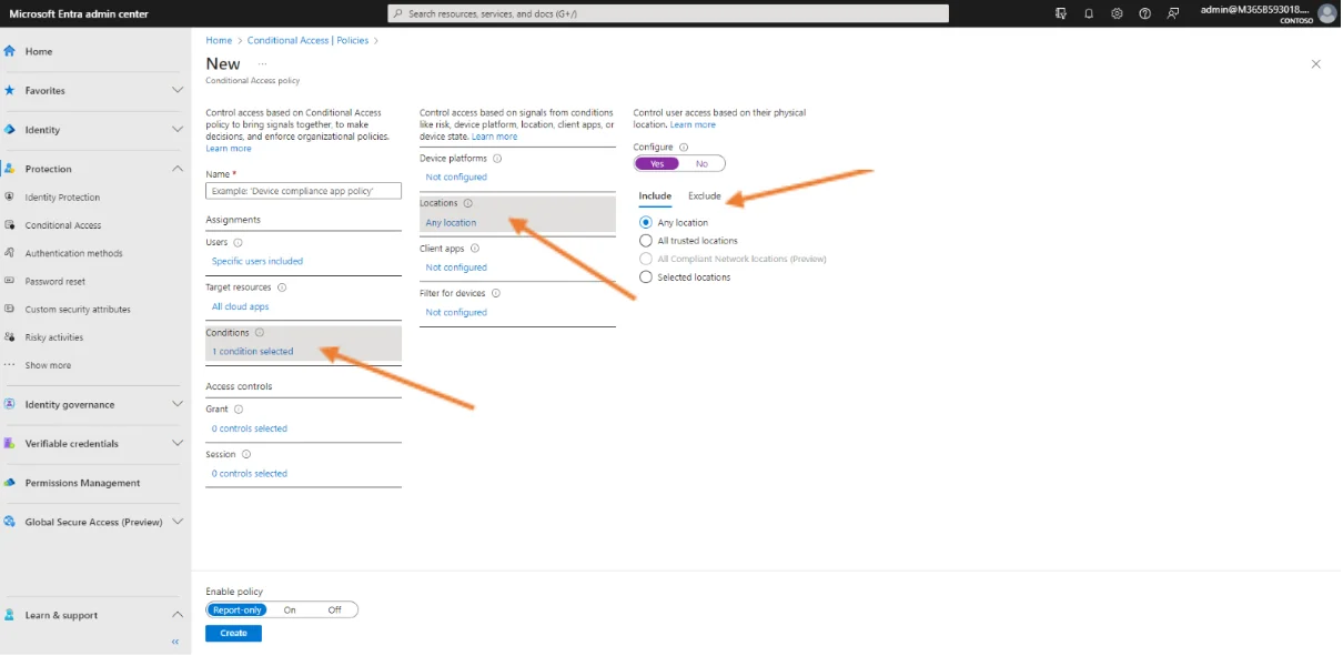 Fourth, navigate to the Conditions subsection, click on “0 conditions selected”, then in Locations click on “Any location”, under configure choose Yes and choose “Any locations”.