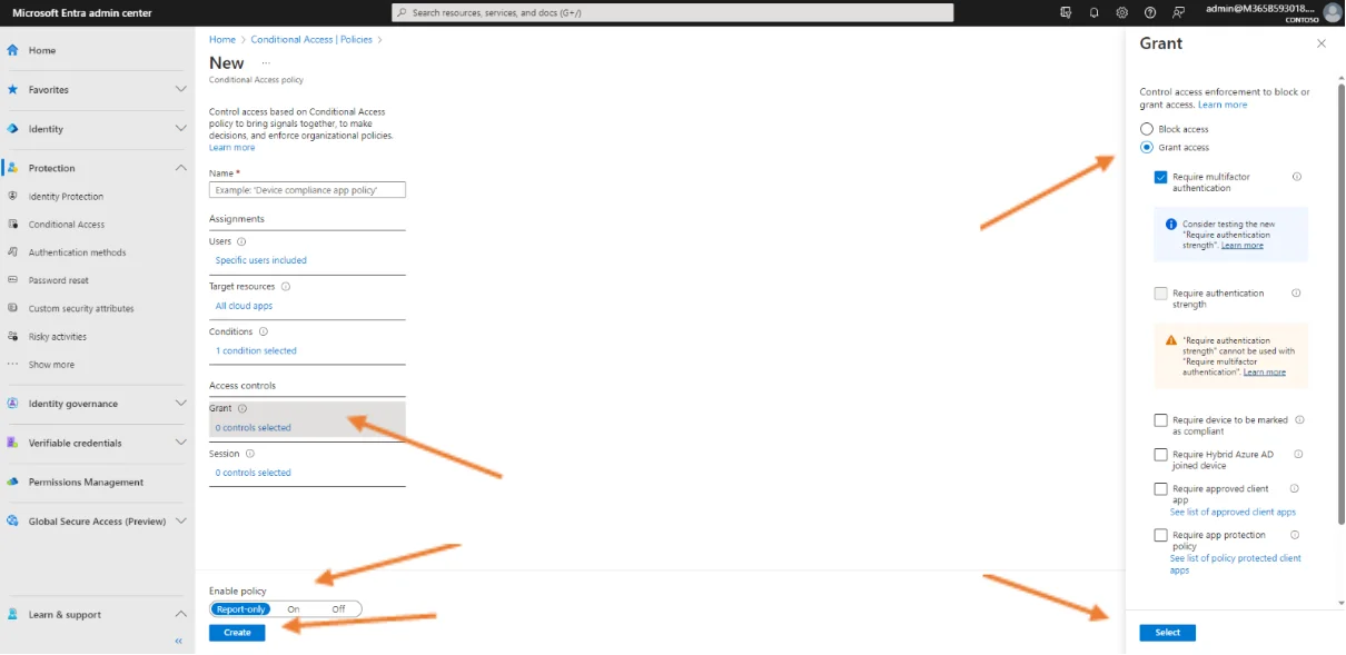 Finally, as far as the configuration requirements, navigate to the Access Controls section in the Grant subsection, click on “0 selected controls”. Then click on Require multi-factor authentication and click Select.