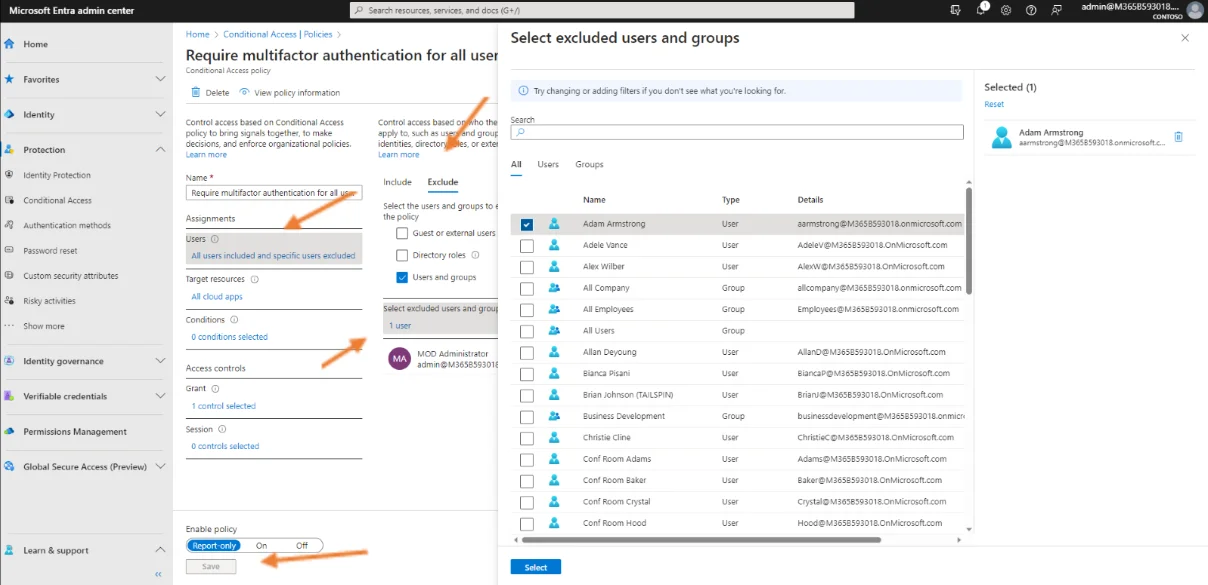 To do this, click on the “Require multi-factor authentication for all users” policy. In the Assignments section, Users subsection, click “All users included and specific users excluded” and on Exclude. Click on “1 user”, because there was already a user excluded from this policy. Put a check mark next to the new user to be excluded, then Select and Save.