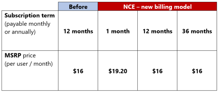 - The monthly subscription is 20% more expensive than the annual or three-year subscription but gives the customer more flexibility when it comes to increasing, reducing, and canceling subscriptions or licenses.